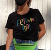 Camiseta oficial de Feismo Cool con el logo de colores sobre fondo negro.